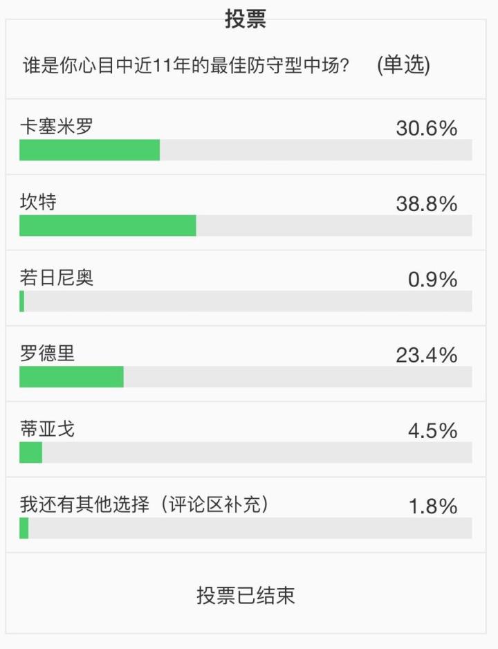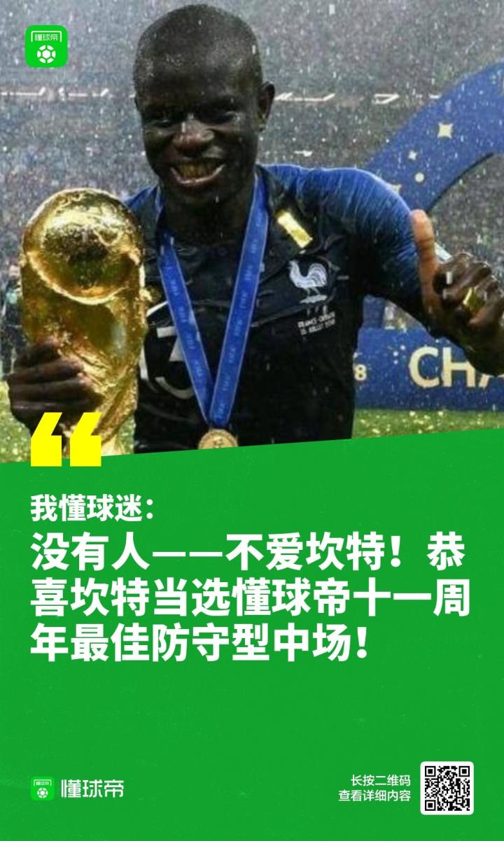 12月2日,懂球帝十一周年最佳11人评选继续进行。在第三日防守型中场的评选中,坎特以38.8%的得票率,当选最佳防守型中场。这一殊荣是对坎特在足球领域取得的巨大成就和贡献的肯定。